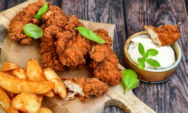 Krompir oljuštiti, oprati i iseckati. Posebno pomešati prezle i rendani kačkavalj, a margarin istopiti. Meso iseći na manje komade i svaki umočiti u margarin, a potom uvaljati u smesu sa prezlama. Ređati po sredini podmazanog pleha. Sa strane staviti krompir, posoliti po ukusu, preliti preostalim margarinom i peći na 180 stepeni oko 40 minuta.