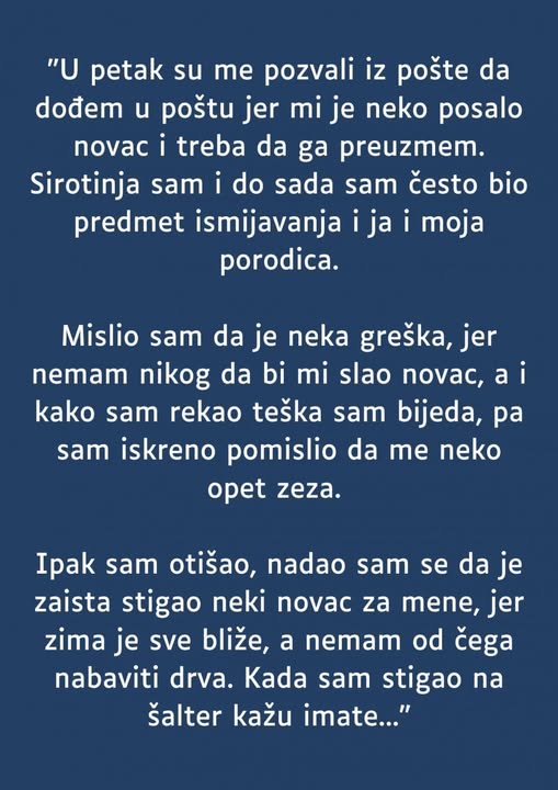 Mislio sam da je neka greška, jer nemam nikog da bi mi slao novac, a i kako sam rekao teška sam bijeda, pa sam iskreno pomislio da me neko opet zeza. Ipak sam otišao, nadao sam se da je zaista stigao neki novac za mene, jer zima je sve bliže, a nemam od čega nabaviti drva. Kada sam stigao na šalter kažu imate pismo i 3000 dolara, i dalje nisam mogao da vjeruje.